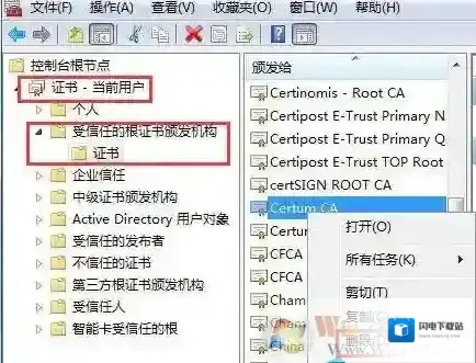 6、展开“证书”=》“受信任的根证书颁发机构”=》“证书” ,在右侧列表中查找你需要删除的证书,然后在将其删除;