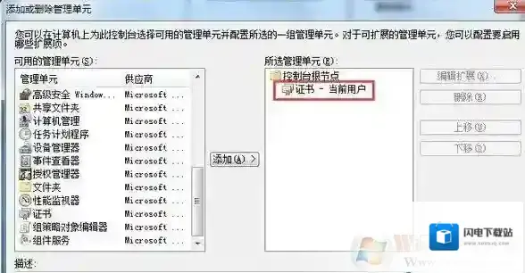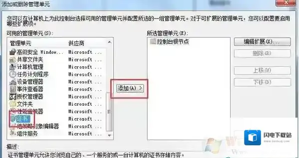 3、在弹出的窗口左侧列表中选中“证书”在点击“添加”;