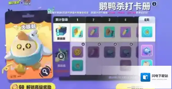 3、第三款皮肤大眼鹅需要购买鹅鸭杀打卡册,并且每日连续登录获取奖励,连续登录6天即可解锁这款皮肤了。