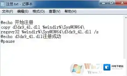 解决方法二1、对应文件放在文件内后,把代码:01@echo 开始注册copy d3dx9_41.dll %windir%system32regsvr32 %windir%system32d3dx9_41.dll /s@echo d3dx9_41.dll注册成功@pause复制代码