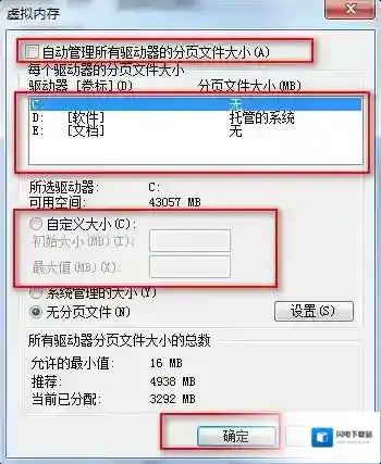第四步:在弹出的窗口中取消勾选“自动管理所有驱动器的分页文件大小(A)”,然后选择要设置虚拟内存的盘符,勾选“自定义大小”,在设置了合适的虚拟内存大小后点击设置,最后点击确定完成设置操作。这里的具体磁盘以及大小,大家根据自己的需要来划分哦!