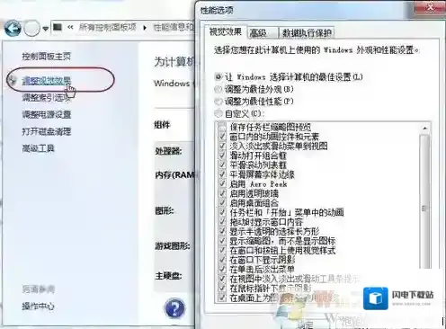 在新窗口中打开“调整视觉效果”项,此时就可以看到视觉效果调整窗口了。Windows 7默认是显示所有的视觉特效,这里你也可以自定义部分显示效果来提升系统速度。