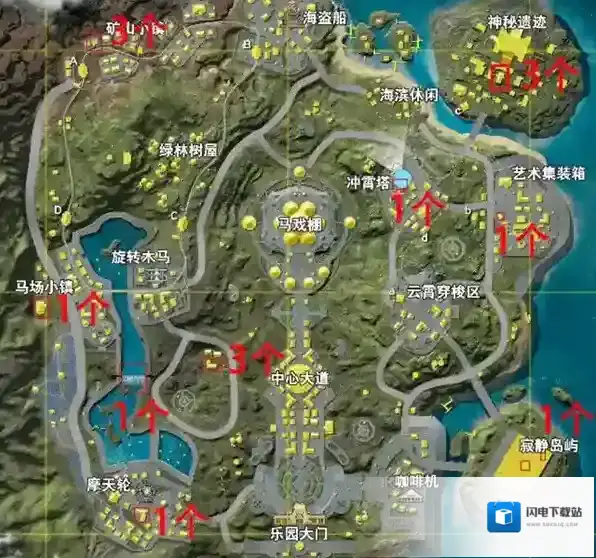 首先为各位玩家附上荒野行动中荒野乐园地图中共计16处杰克的宝箱的具体位置参考图如下: