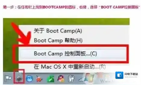 2、安装过BootCamp后,右下角会有一个图标,右键点击,打开Boot Camp控制面板;