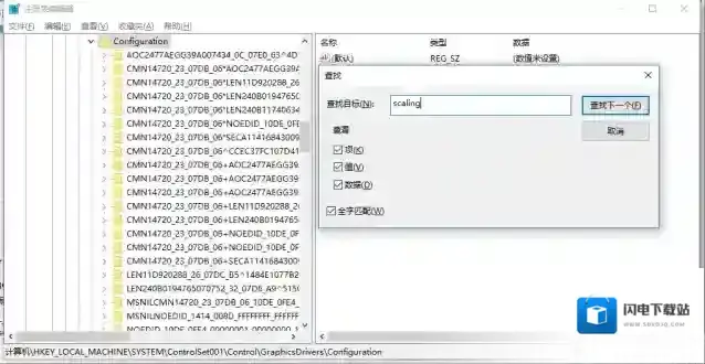 然后找到HKEY_LOCAL_MACHINESYSTEMControlSet001ControlGraphicsDriversConfiguration,然后点击ctrl+F输入搜索scaling,然后修改键值为5(如果分辨率是1080,1366*768的话修改为3或4),然后重启电脑后再试一下
