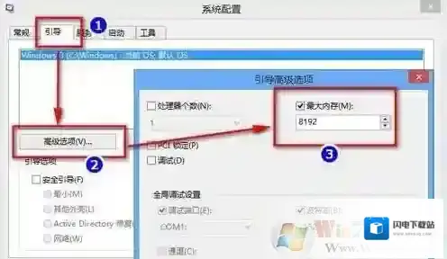 2、若安装系统是64位系统,确定之前使用正常,可以按下键盘Windows键和R键,出现界面输入“msconfig”,点击确定。出现界面点击“引导”“高级选项”,查看是否设置了“最大内存”,点击“高级选项”卡(把最大内存前钩去掉),然后确定。