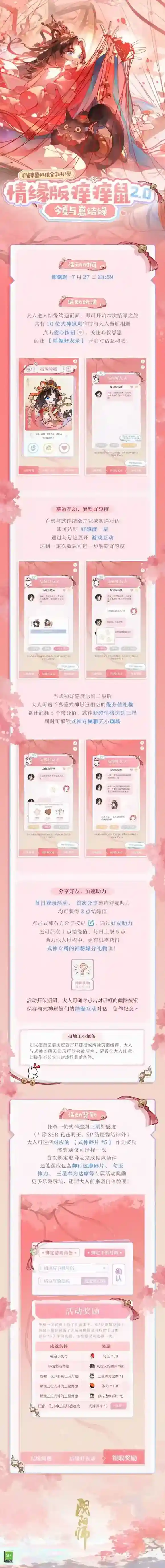 活动期间,任意一位式神达到三星好感度(除SSR孔雀明王、SP纺愿缘结神外)即可选择对应的式神碎片*5作为奖励!(仅可选择一次)