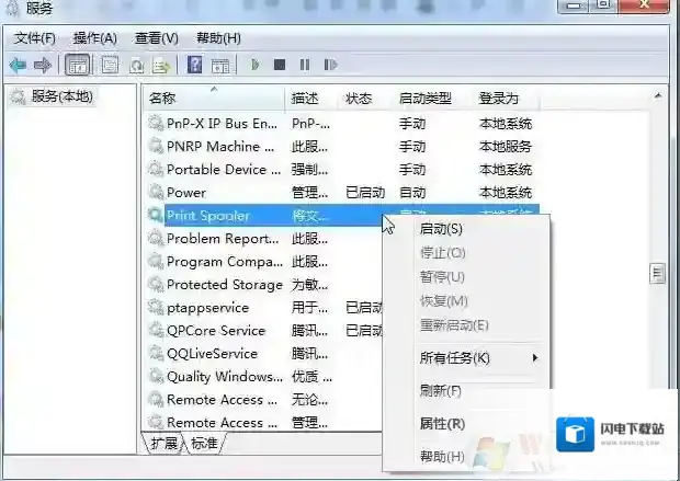 2、在右侧将“printspooler”服务单击右键,选择“启用”,如果启用为灰色的话需要双击去服务属性中把启动类型设置为自动。