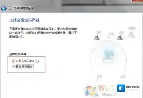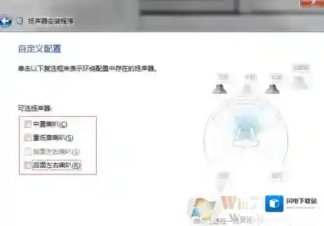 5、在新界面左侧,取消勾选“环绕扬声器”(同样因为 2.1声道并无此设备),进入下一步;