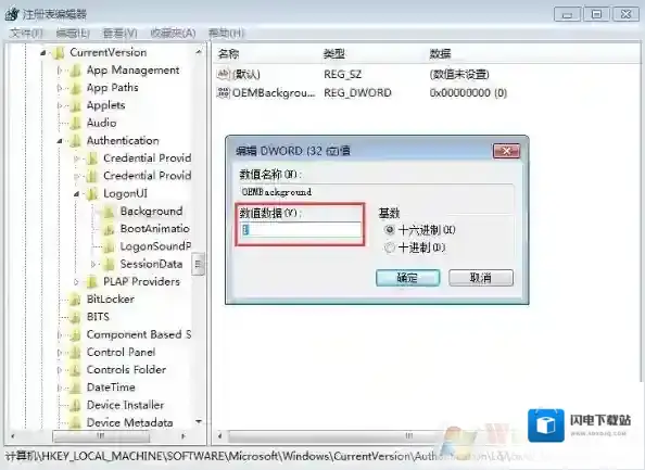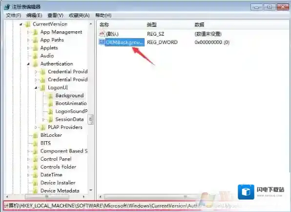 2、定位到:HKEY_LOCAL_MACHINE/SOFTWARE/Microsoft/Windows/CurrentVersion/Authentication/LogonUI/Background”,然后在右侧找到“OEMBackground”的双字节值,如果没有就自己新建一个,然后将数值修改为1;