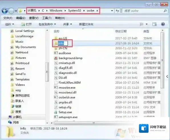 3、接着我们打开“C:WindowsSystem32oobe”目录,创建一个名为“info”的文件夹;