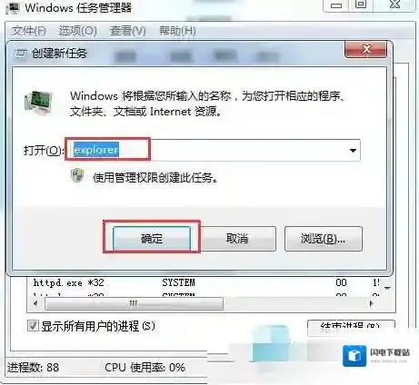 3、结束后,再点击“文件”–“新建任务(运行)”–输入“explorer.exe”回车;