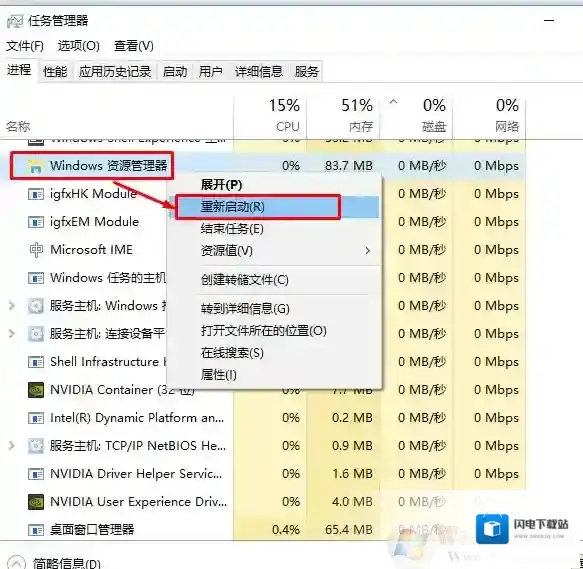 2、重启windows资源管理器,缓解当前桌面卡顿卡死问题,音量图标可能就会显示了。