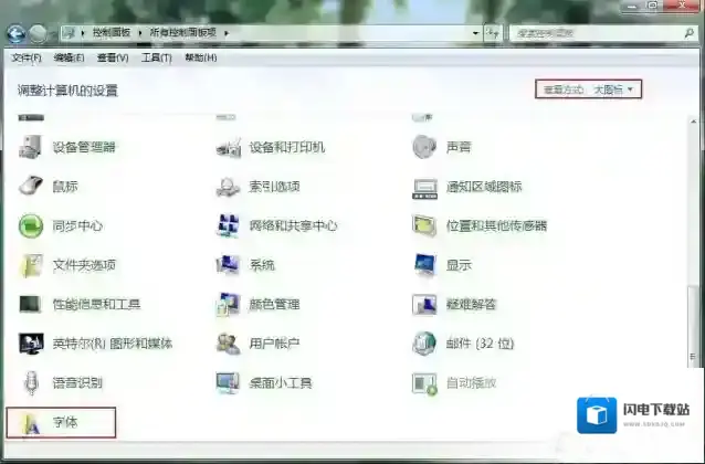 3、把弹出窗口左上角的查看方式改为“大图标”,然后找到“字体”项,如下图所示: