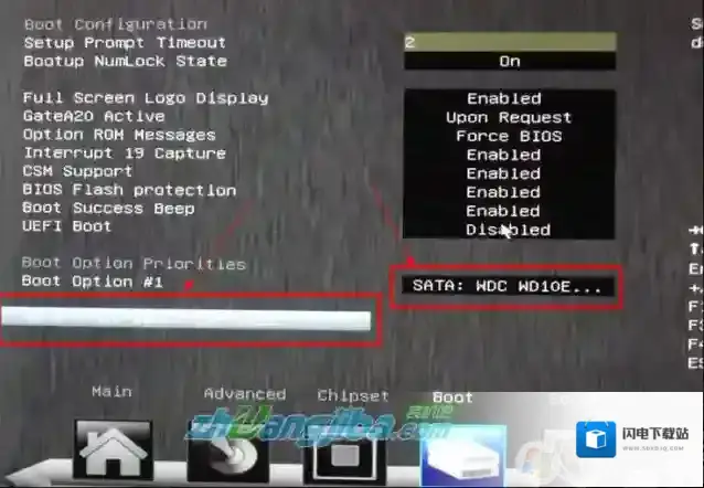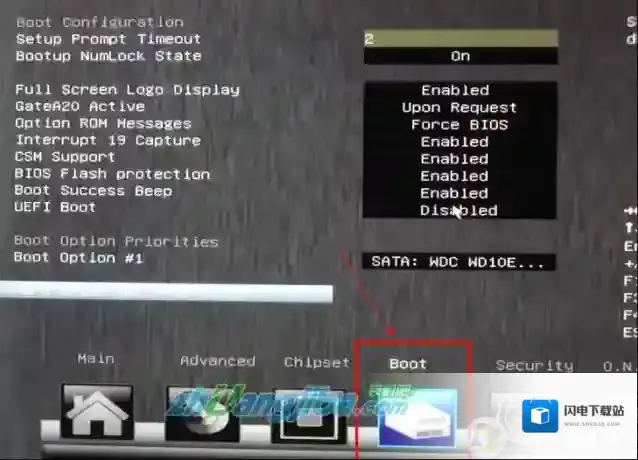 3.然后通过“↑↓”键移动光标至“HardDriverBBSPriorities”处,回车打开注:我们可以在图中看到“bootoption#1”项右侧显示的是SATA:WDCWD10E…这就说明你的硬盘现在是第一启动。