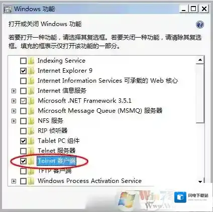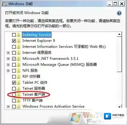 5.勾选Telnet客户端,单击确定。打开Telnet客户端;如图: