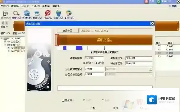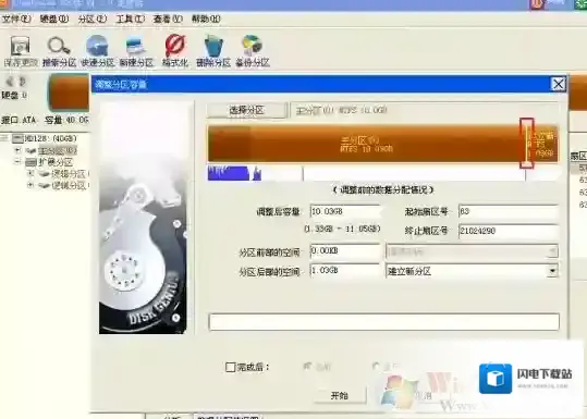 4、鼠标按住左键,从最左侧的磁盘条状图形向右拖动到你认为合适的扩容容量,或者在下面“分区前部的空间”处填写,注意这里的单位是KB。确定要扩容的容量无误后,点击“开始”运行,如图所示: