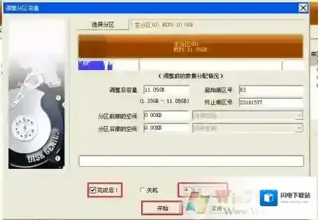 8、接着我们勾选“完成后”选择“重启”,然后点击开始即可进行C盘空间的扩容!