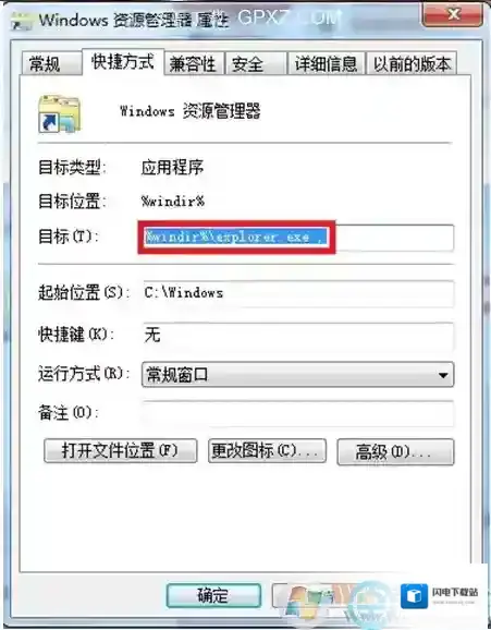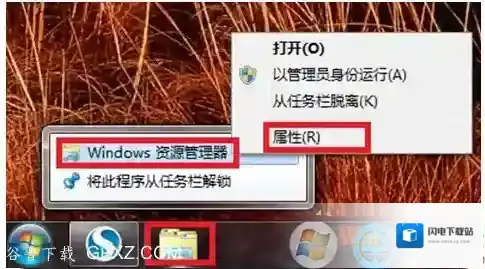 2、右键选择任务栏上的资源管理器快捷方法,再右键选择Windows 资源管理器,打开属性。在属性中目标一栏中粘贴引号内的代码:%windir%explorer.exe ,;