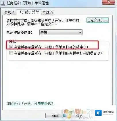 2、然后在开始菜单选项卡下,隐私一项中,勾选 储存并显示最近在开始菜单中打开的程序选项,确定;