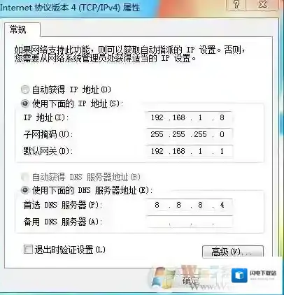5、然后我们可以设置IP地址,自动获得(路由器自动分配(推荐))手动设置 :IP地址 设置为 路由器同一号段 如路由器IP地址(也就是网关)为192.168.1.1 那么你可以设置电脑的IP地址为 192.168.1.XX可以是 2-255之间的数值子网掩码设置为255.255.255.0 默认网关为路由器IP地址 DNS服务器地址 使用本地或公用地址。