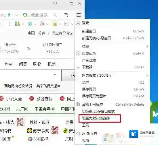 如360浏览器: 在右上角打开更多设置,然后选择设置为默认浏览器即可。