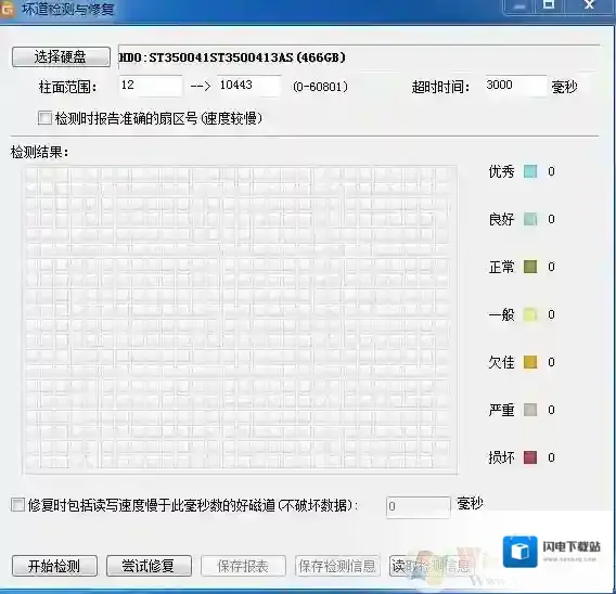 2、选择要检查的硬盘,设定检测范围(柱面范围)。点击“开始检测”按钮,软件即开始检测坏道。发现坏道时会将坏道情况显示在对话框中,如图所示: