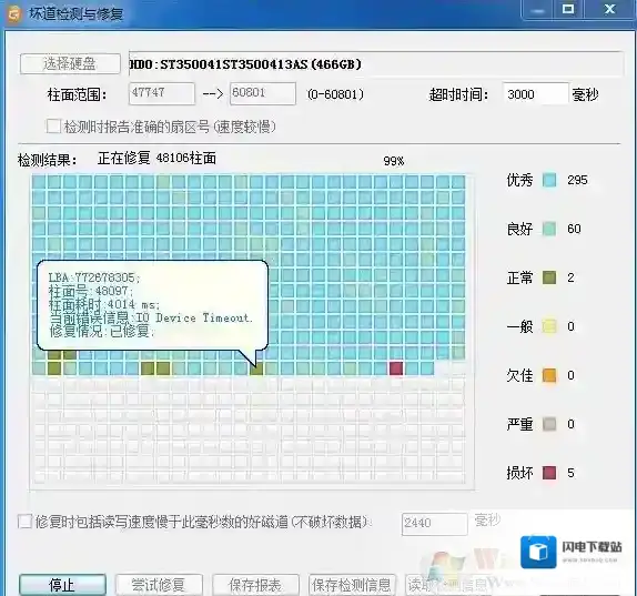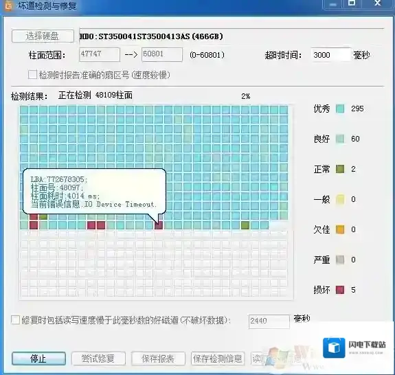 3、检测过程中遇到坏道时,检测速度会变慢。检测完毕,软件报告检测到的坏道数目,如图所示: