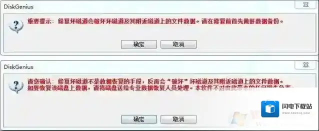 4、接着我们点击“尝试修复”按钮,但在这之前首先要确保当前坏道分区中是否有重要资料。坏道修复会破坏数据,而不是恢复数据!在可能的情况下,一定要先对磁盘数据进行备份。为了数据安全,建议不再使用已出现坏道的磁盘。即使坏道已经修复。尤其不要在其上存放重要数据。