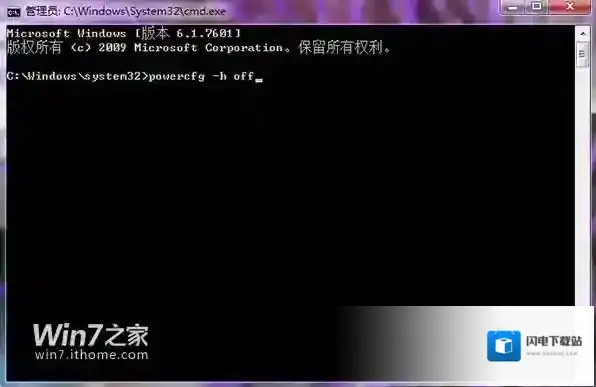 2、然后输入关闭休眠命令: powercfg -h off 回车