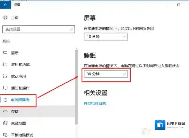 3、选择电源和睡眠。将睡眠时间选择为从不即可。