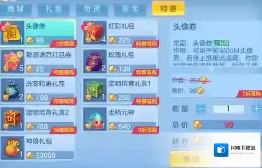 新服开启的前半个月开放特惠商城,其中出售包含头像劵、洗宠特惠礼包、坐骑元神等多种超值限量道具!