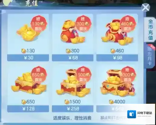 所有角色首次购买各个档位的金币时,皆可获得额外赠送的等量金币。