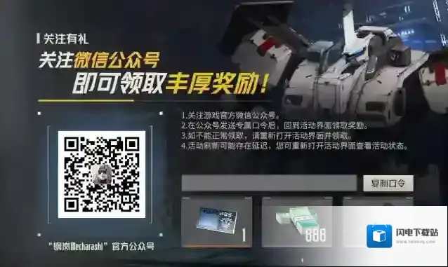活动时间:永久活动内容:各位指挥官可以前往活动中心→关注有礼,复制口令并扫码前往官方公众号:钢岚Mecharashi,通过私信的方式兑换关注奖励。奖励内容:转运许可1、米赫玛元888、初级战术影像*6公测开服后的福利活动盘点啦~指挥官们是不是已经迫不及待想要登岛了呢?在公测当天还会有更多福利等着各位,2023年12月8日上午10:00,我们不见不散!