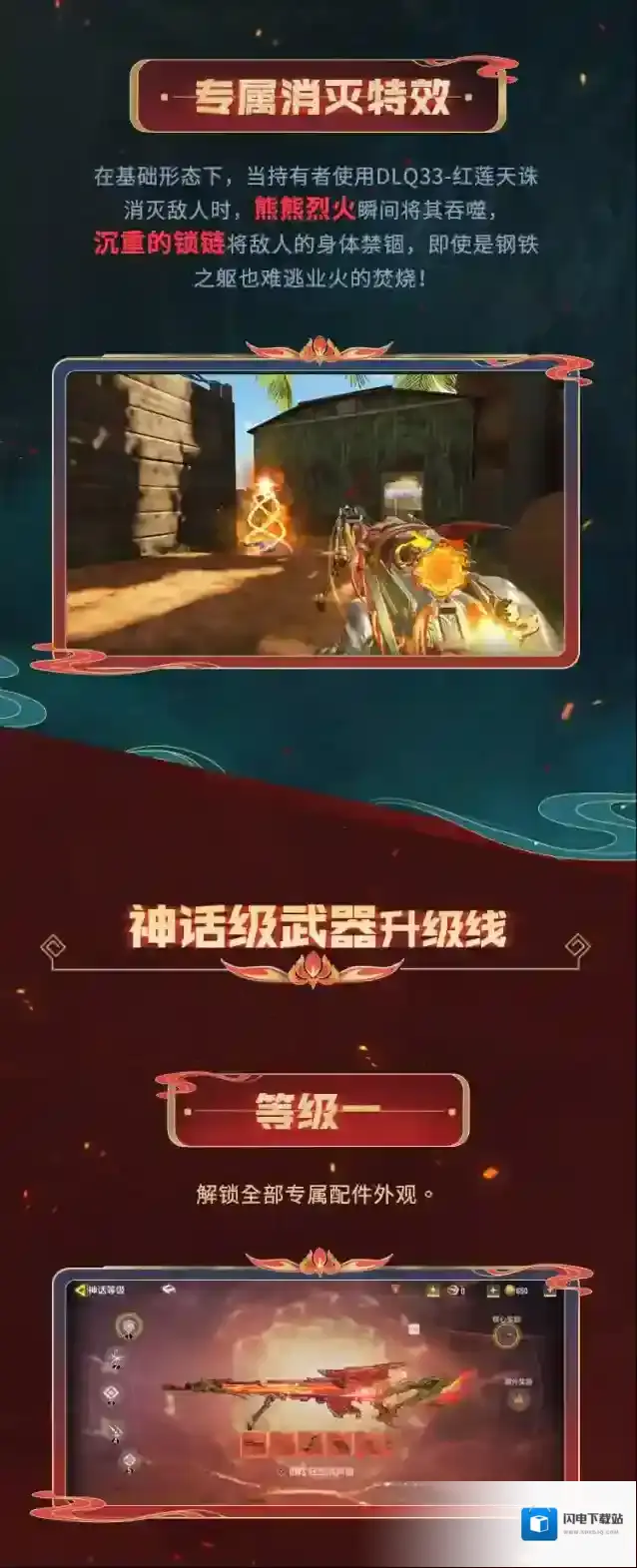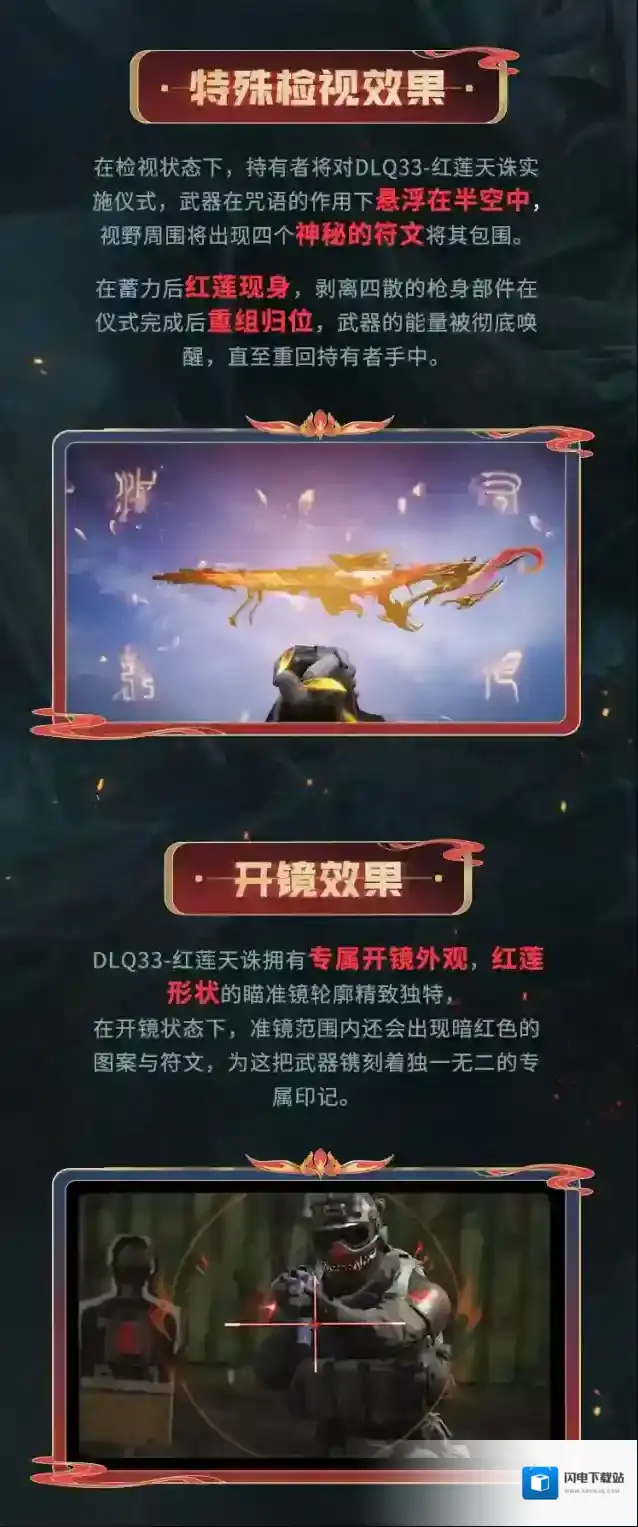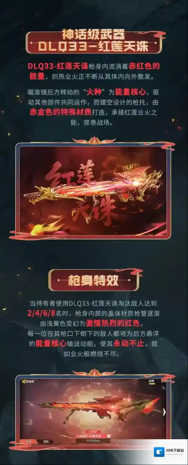黑夜中诞生的火光,其形如红莲,其名为天诛。业火红莲凝聚而成的这支全新神话武器–DLQ33-红莲天诛