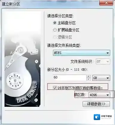 分区和4K对齐:分区,分区的时候可以跟普通硬盘一样分区,不过一些要记得勾选“对齐到下列扇区数的整倍数”,然后选择4096,4K对齐能让读取写入的速度更 快。如图所示: