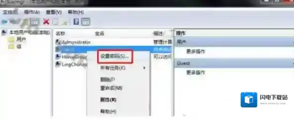 2、接下来我们就在打开的管理界面里面,依次展开“本地用户和组-用户”,在右边窗口里面使用鼠标右击账户“Guest”选择所需要进行设置密码;如下图所示: