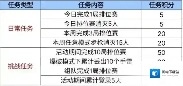 任务预览活动任务的难度并不高,基本上都和参与排位赛、排位赛杀敌和累计登录相关,即使是火线萌新也能轻松完成。大家可以点击下图提前预览任务内容,便于活动上线后直接开干。