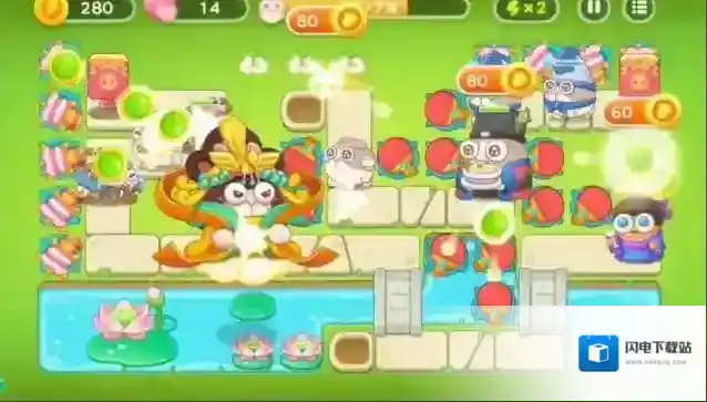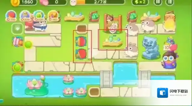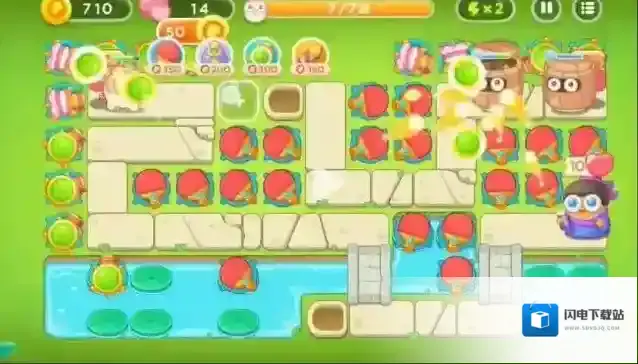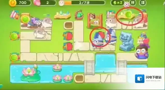 1、开局之后使用乌龟打左边的建筑,获得金币给乒乓球升级消灭兔子。