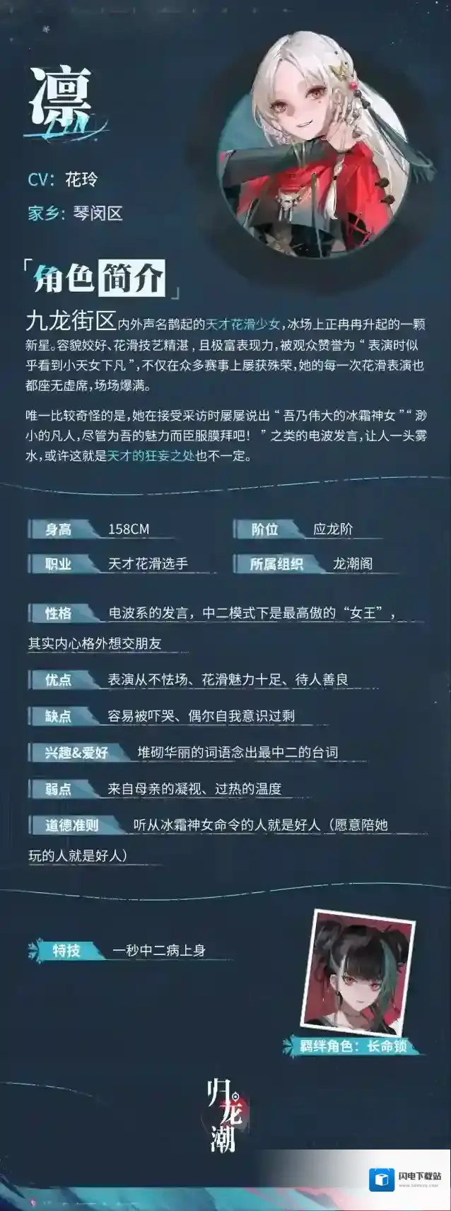 作为花滑领域的优雅冰精灵、九龙街区的花滑新星,「凛」在人们眼中是位元气满满的天才少女;而另一方面,她却又是抽象“凛学”的创始人,十万伏特输出全开的电波系发言,常常让人哭笑不得。虽说表面中二高傲,但凛的内心也会因交到新朋友而感到高兴~