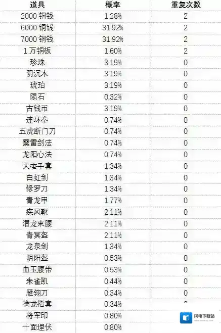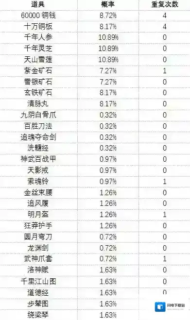低阶藏宝图的物品和概率如下: