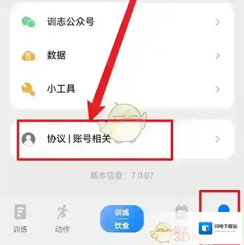 1、打开训记app,进入我的界面,点击协议/账号相关。