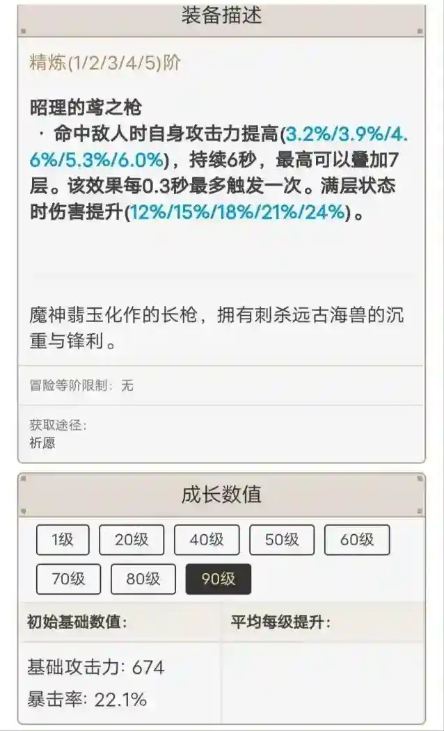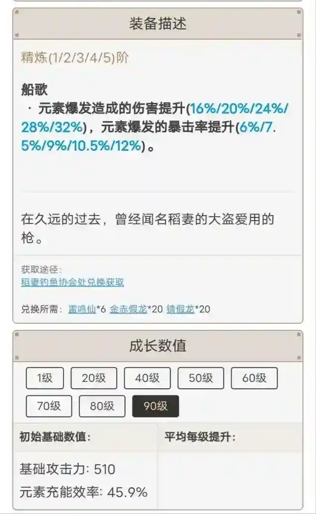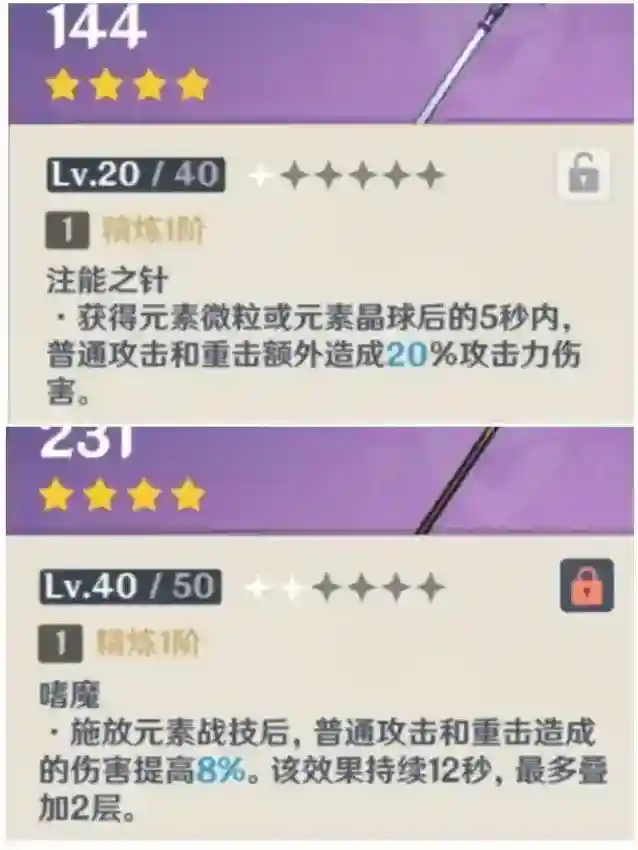 理由相同,词条是元素充能效率,武器技能可以弥补一定的暴击率,同时还能加快攻速,优化雷电将军元素爆发后普攻的手感,本身白字也较高,但是相对于薙草之稻光的充能效率和攻击力加成上都比较低