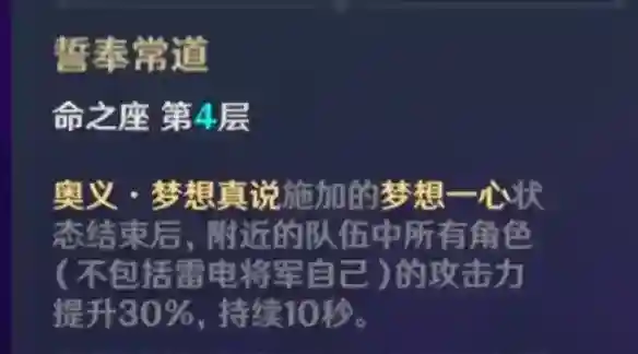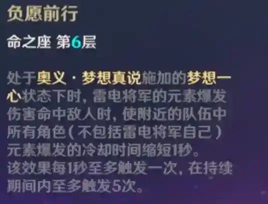 命座解析:雷电将军的六命,辅助命座,可以在『梦想一心』的状态下打伤害的同时并减少队友的元素爆发冷却,加快队伍技能循环,但是性价比比较低