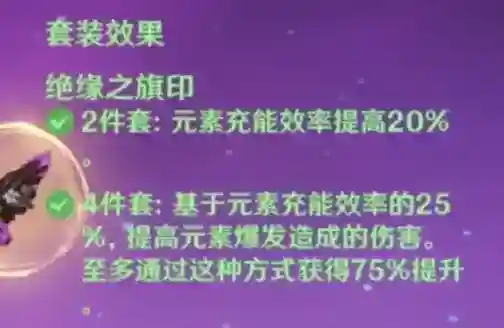 绝缘之旗印这套圣遗物是目前最符合雷电将军的圣遗物,两件套提高元素充能效率,四件套根据充能效率提高元素爆发伤害,几乎满足了雷电将军所有都需求