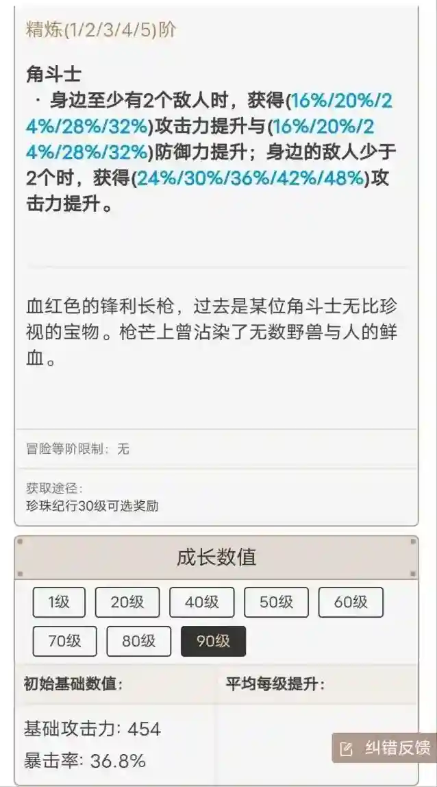 4行纪行武器,词条是暴击率,武器技能可以提供一定的攻击力和防御力加成,缺点是武器白字比较低