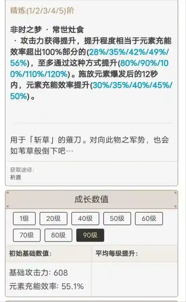 专武级别的武器,目前最契合雷电将军的一把武器,词条是元素充能效率,既符合雷电将军天赋的元素充能效率转换,虽然本身武器白字在五星武器中不算突出,但是武器技能还能通过元素充能效率转换一定比例的攻击力,弥补攻击力的不足