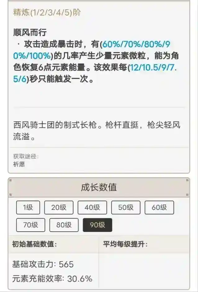 词条是元素充能效率,但是相对于其他武器充能较低,武器技能提供元素微粒,优点是武器白字较高,在有渔获或者决定之枪的情况下不推荐使用