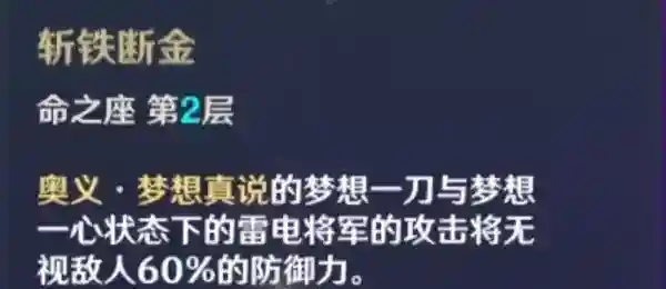 天赋解析:雷电将军又一核心天赋,可以通过雷电将军超过100%的部分提供雷电将军的雷元素伤害和『梦想一心』状态下为队伍提供的充能,大体决定了雷电将军圣遗物和武器词条的选择