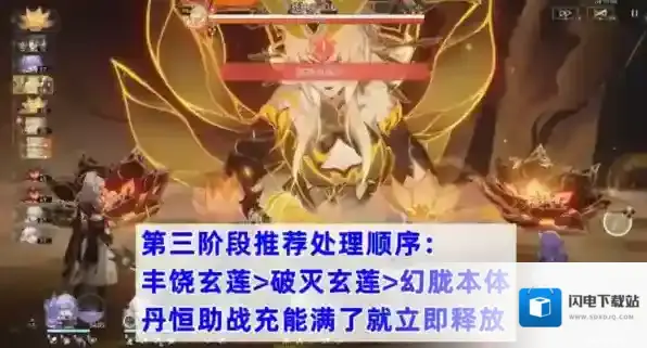 进入最后一阶段,幻胧本体开场会进行两次攻击,并且自带两朵丰饶玄莲和两朵破灭玄莲。机制和前两阶段没有太大区别,难点在于丰饶玄莲和破灭玄莲同时出现。此时推荐的处理顺序为:丰饶玄莲 破灭玄莲 幻胧本体。战技点优先留给生存位保命,丹恒的助战攻击充能满了就立即释放。